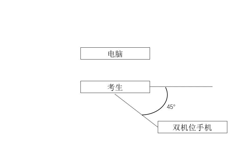 (2)第二机位:手机端摄像头拍摄作为“第二机位”,从考生后下方成45°距离本人1m处拍摄(示意图如下),可以拍摄到考生侧面及主设备电脑全屏幕,需保证面试考官能够从第二机位清晰看到第一机位屏幕,用于采集“第一机位”的显示器的音、视频信息及考生本人画面,以监控考生复试过程。
