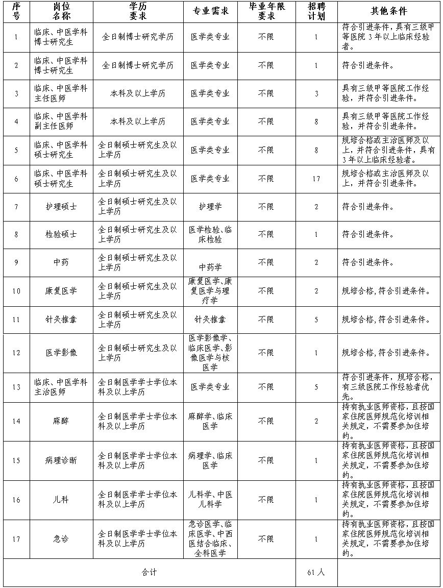 为加快临沧市中医医院建设与发展,充实临沧市中医医院专业技术人才队伍,推进医院人才队伍和学科建设,提升医院综合实力,现面向社会公开引进一批急需紧缺专业技术人才,现公告如下: 一、引进岗位 招聘计划岗位61名,其中临床、中医学科博士研究生1人,临床、中医学科博士研究生1人,临床、中医学科主任医师3人,临床、中医学科副主任医师8人,临床、中医学科硕士研究生8人,临床、中医学科硕士研究生17人,护理硕士2人,检验硕士1人,中药2人,康复医学2人,针灸推拿5人,医学影像1人,临床、中医学科主治医师5人,麻醉2人,病理诊断1人,儿科1人,急诊1人(详见:具体岗位条件及资格)。 二、引进条件及资格 (一)基本资格条件 具有中华人民共和国国籍,拥护中国共产党的领导,热爱社会主义,符合国家对医疗卫生事业执业资格要求,具有良好的品行、正常履行职责的身体条件、符合职位要求的工作能力和专业素质,以及法律、法规规定的其他条件。引进人员原则上为市外就业的人员和市内外未就业的人员,同时须具备以下条件之一: 1.医学类专业研究生及高级卫生专业技术职称人员,年龄原则在50岁以下; 2.医学类专业全日制学士学位本科学历且取得中级卫生专业技术职称、具有科室管理经验人员,年龄原则在40岁以下; 3.医学类专业全日制学士学位本科学历且持有规培合格证人员,年龄原则在35岁以下。 4.医学类专业全日制学士学位本科学历且持有执业医师资格证人员,年龄原则在30岁以下,按国家住院医师规范化培训的相关规定,不需要参加住培的。 (二)具体岗位条件及资格